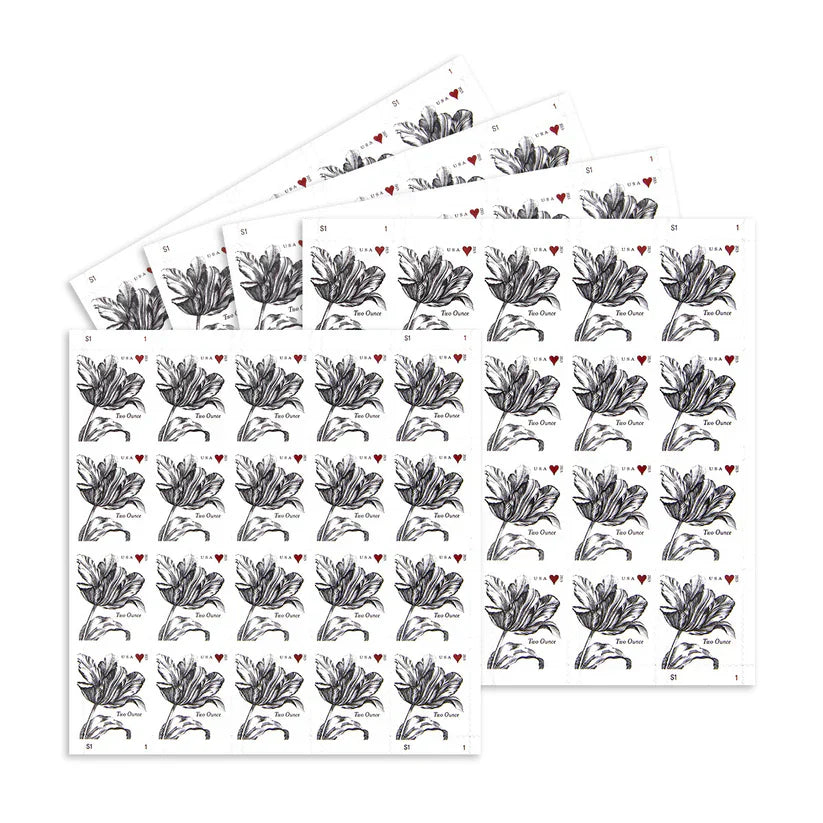 Featuring an elegant black-and-white engraving of a tulip with a striking red heart symbol, this 70¢ stamp was issued by USPS for 2-ounce First-Class mail—ideal for wedding invitations, oversized cards, and elegant correspondence.